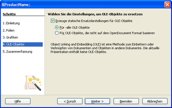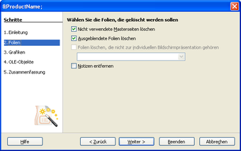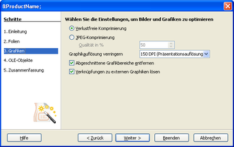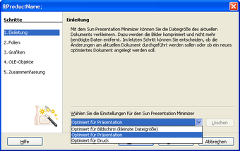 Per Mausklick auf das hinzugefügte Symbol erstellt Sun Presentation Minimizer von einem geöffneten Foliensatz eine platzsparende Kopie. Mit einem Assistenten nimmt man schrittweise die gewünschten Einstellungen vor.